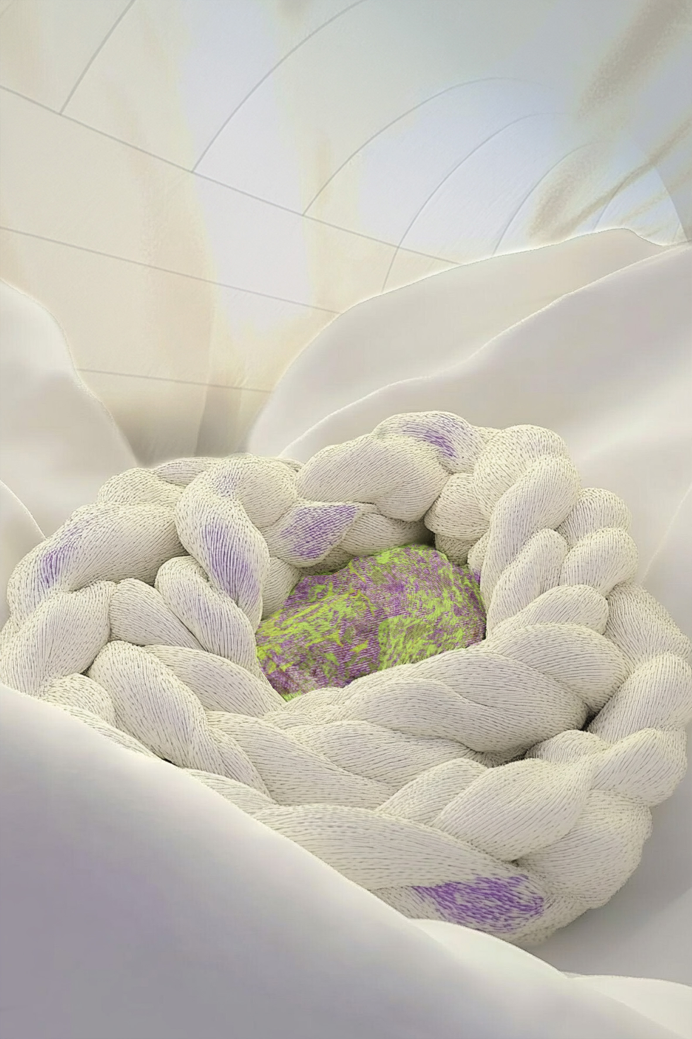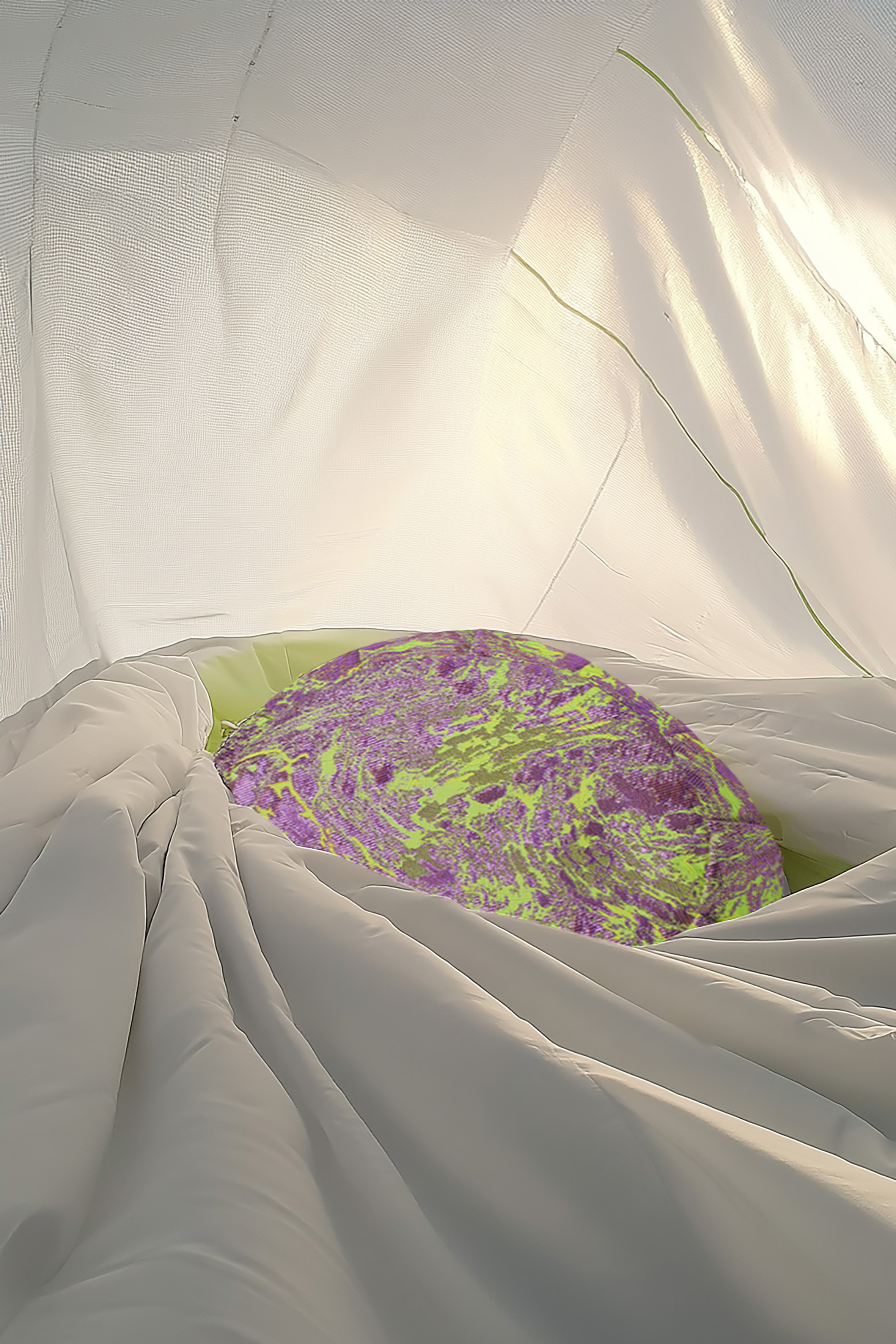 Inside the cocoon, guests are invited to rest on Trippy, a limited-edition meditation pillow by ECHO ECHO (Annabelle Schneider + Yvonne Wigger). Each compact sanctuary is handmade from shimmering deadstock fabrics by Jakob Schläpfer, originally designed for Gucci, and filled with organic Swiss millet or spelt hulls — delicately infused with handpicked lavender. The Trippy pattern evokes the layered beauty of the mind — sometimes vibrant, sometimes chaotic — always worthy of stillness. Visitors are guided through reflection by Weed Auntie’s custom-designed prompts, using the pillow as a tool for pause, grounding, and gentle self-awareness.