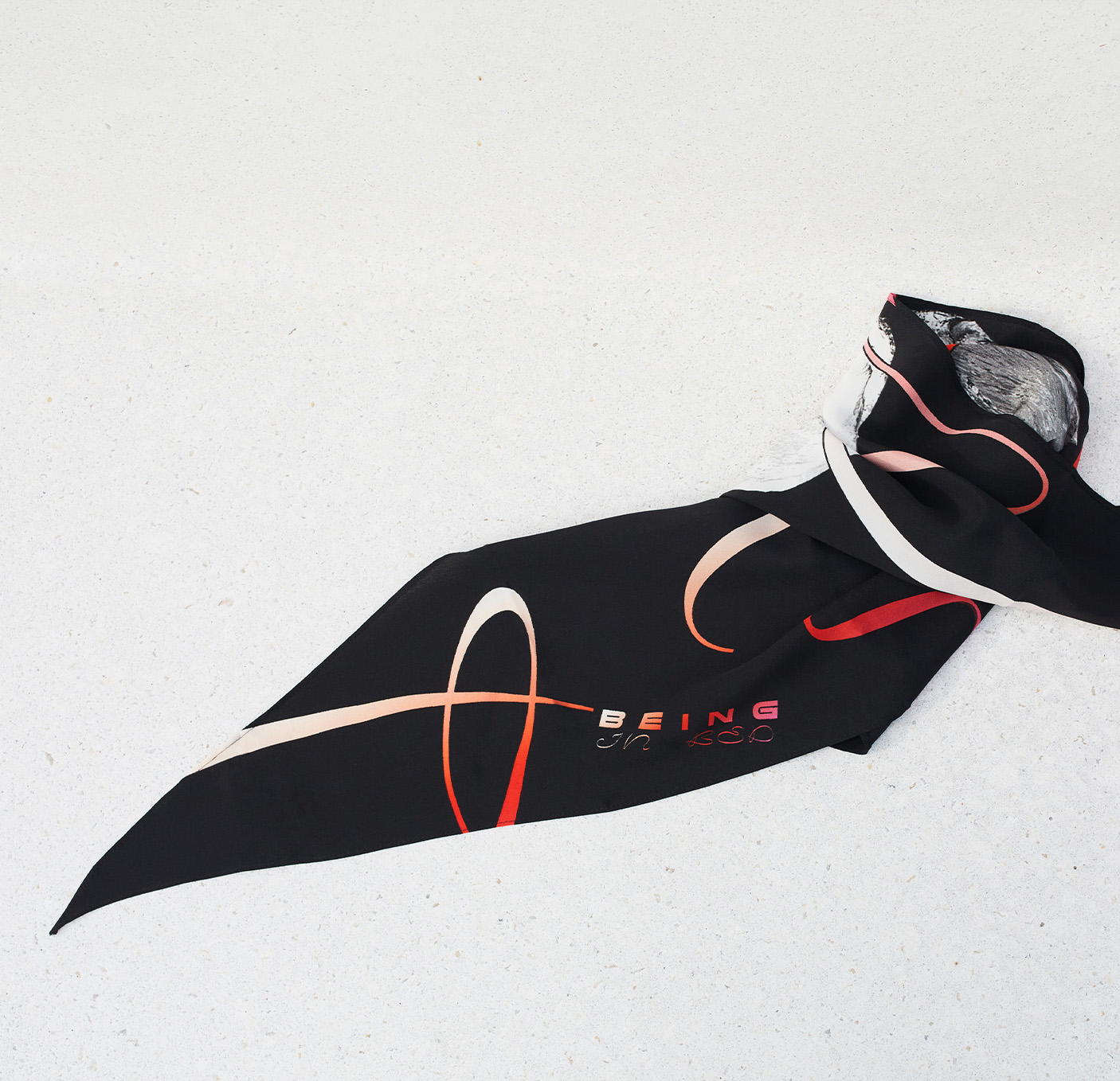 The Diamond Shaped scarf is crafted from silk with a trace of digital hair and the font of a woven thread – a reminder for BEING.