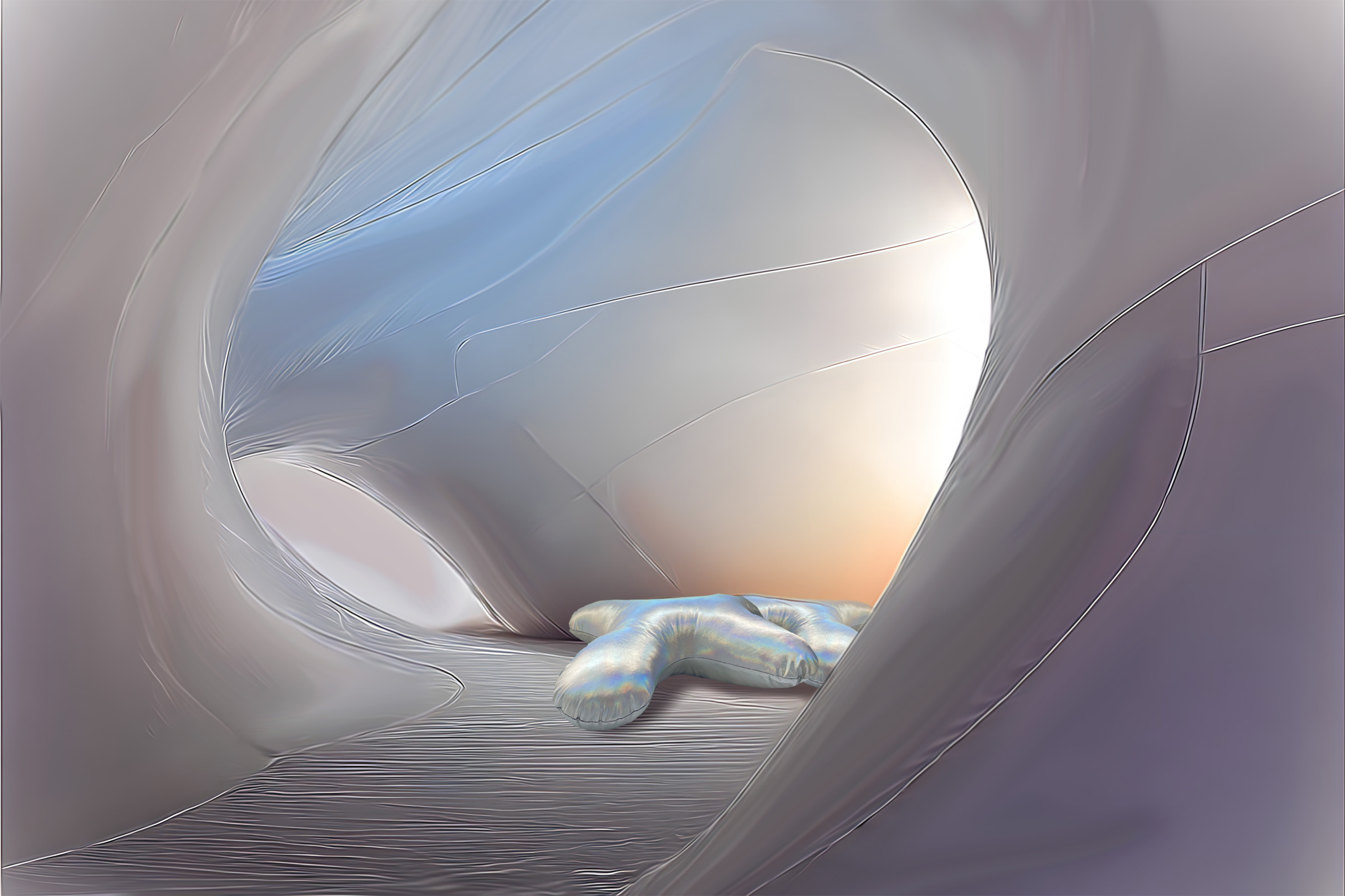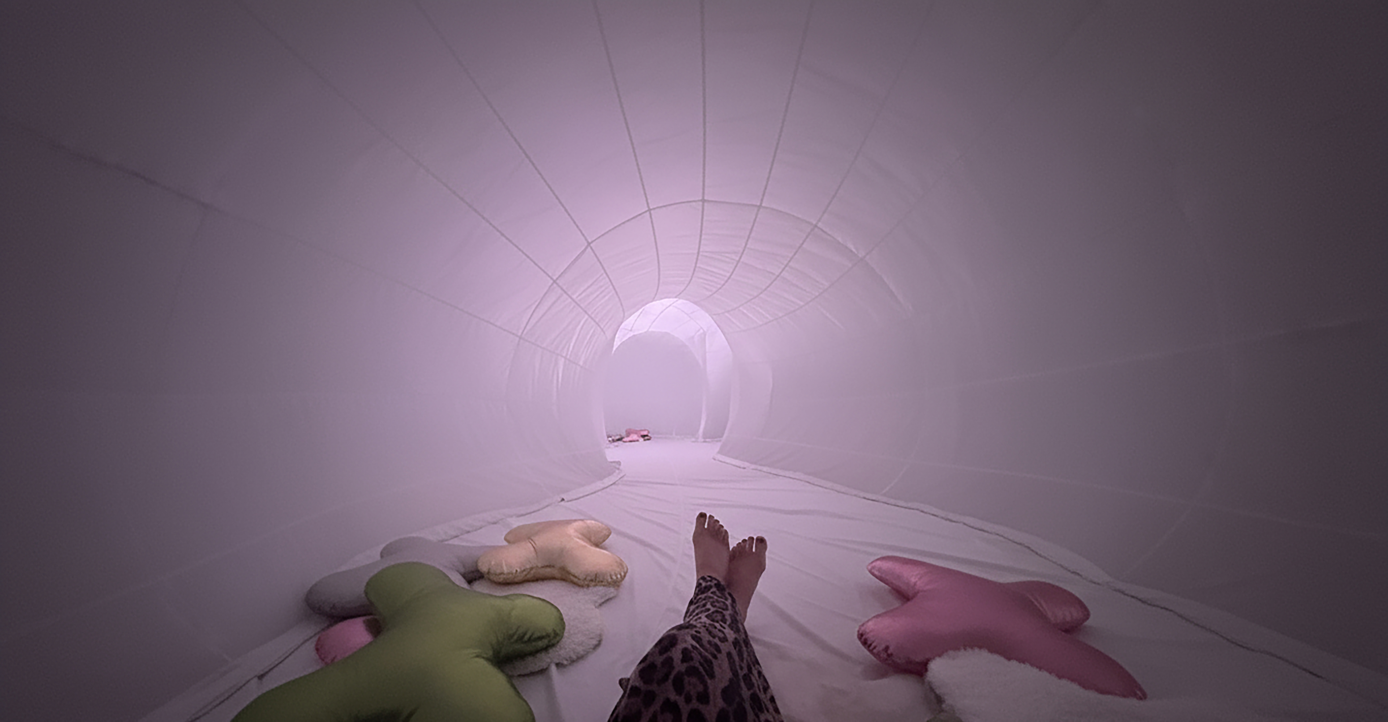 The soft installation represents an ethereal cocoon, a responsive, inflatable structure that breathes with subtle shifts of light, sound, and scent. Inside, visitors are invited into an experience of slowed rhythm and shared presence.